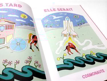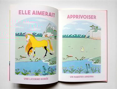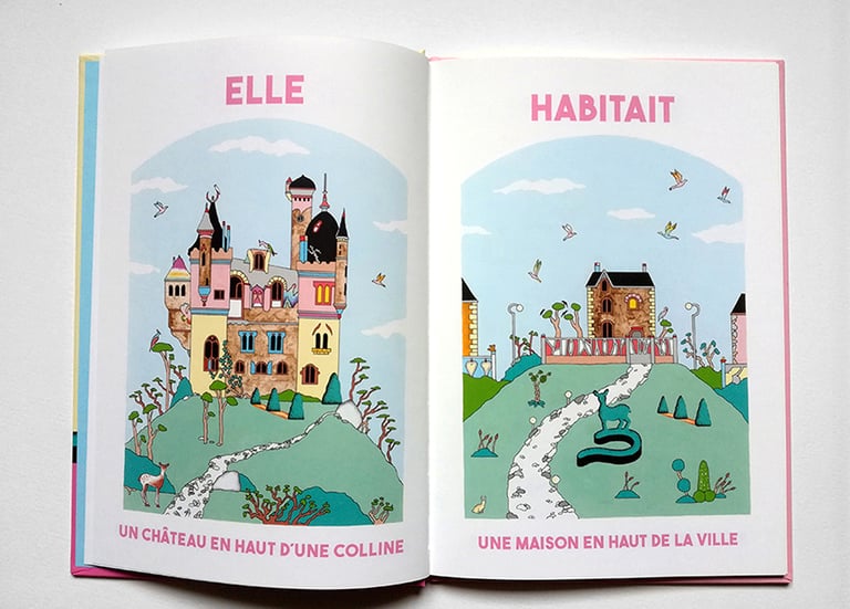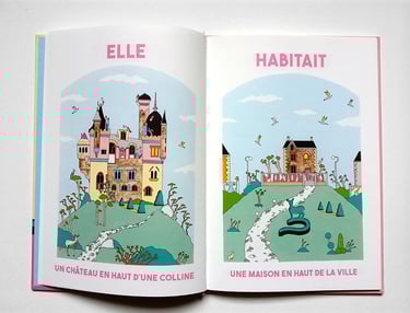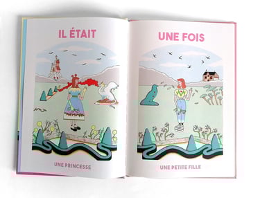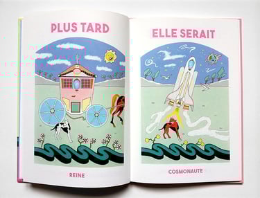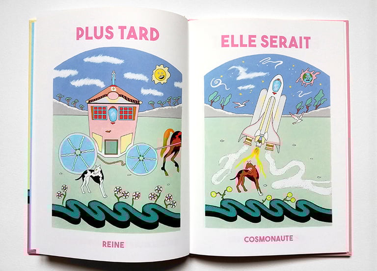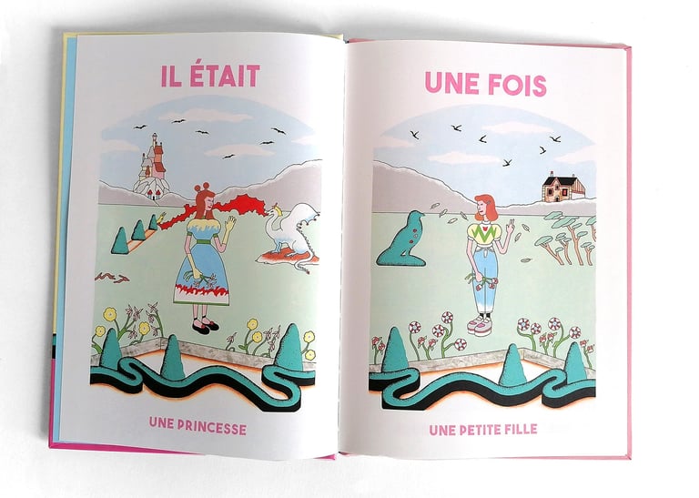 De chaque côté de la page, deux petites filles se font face. Elles se ressemblent comme deux gouttes d’eau, mais habitent pourtant deux mondes différents : l’une a des jouets fantastiques, l’autre une poupée préférée ; l’une porte une robe en mousseline, l’autre un jeans. Plus tard, l’une sera reine, l’autre cosmonaute. Princesse ou petite fille ordinaire, les deux enfants ont les mêmes rêves, les mêmes difficultés, les mêmes questions. Seul diffère le décor de leur existence.